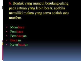 . 12 satuan rumah merupakan satu morfem karena satuan itu memiliki struktur fonologik dan arti yang sama. Morfem book berarti buku dan morfem s berarti penanda plural. Alomorf mem- terbentuk jika bertemu dengan kata yang berhuruf awal b p f dan v.